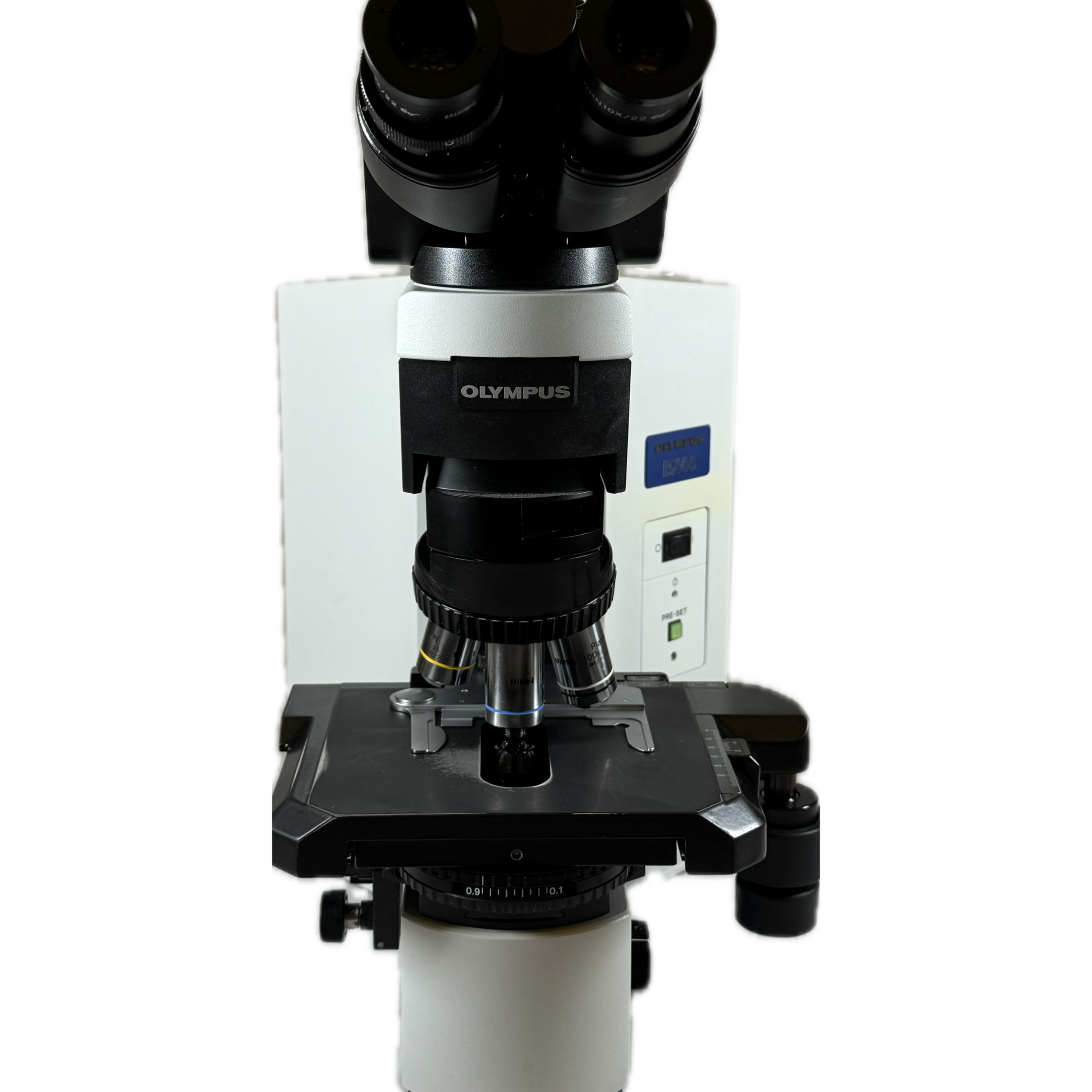 Refurbished Olympus BX-45 microscope with tilting head and 10x/22 eyepieces.4, 10, 40, and 100x plan achromatic objectives. 6V/30W halogen lamp house. Scope comes with a 2 year warranty